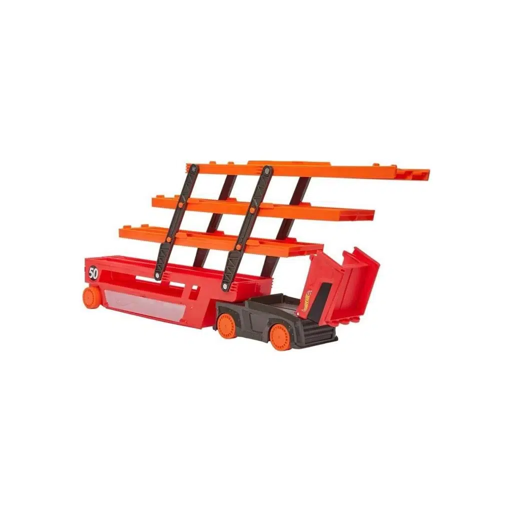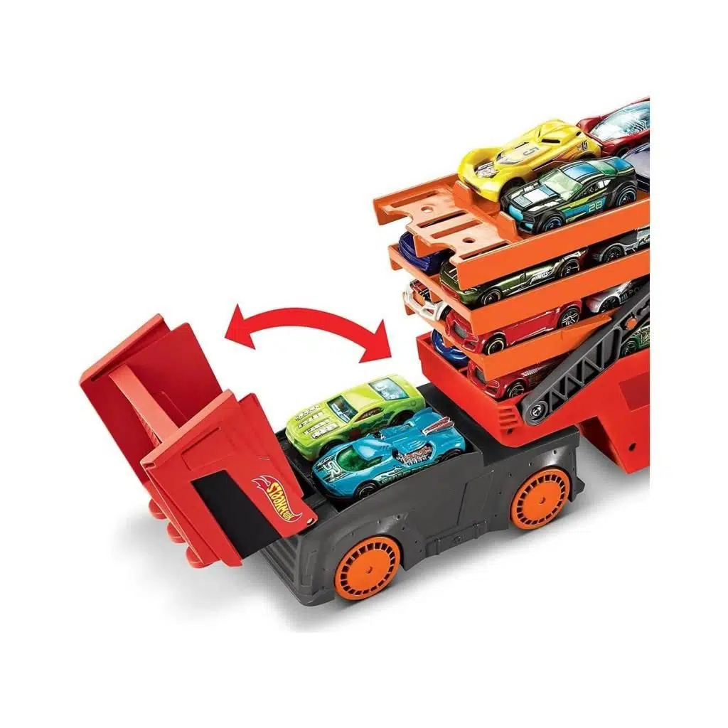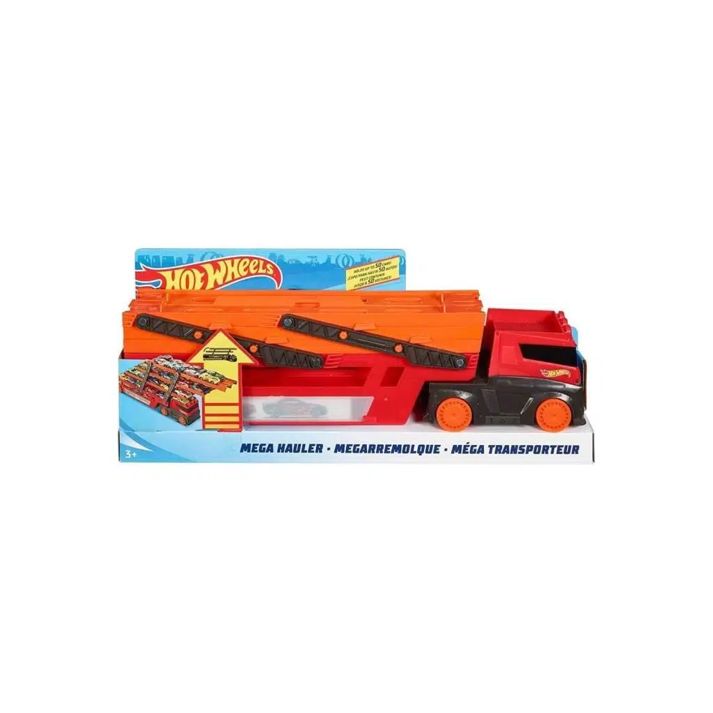 Daha büyük maceralar için daha büyük bir tır! Hot Wheels Mega Taşıyıcı Tır 6 genişleyebilen kademesiyle 50'den fazla Hot Wheels aracı taşıyabiliyor. Hot Wheels turuncu pistleriyle Hot Wheels Mega Taşıyıcıyı Tır'ı birleştirebilir.