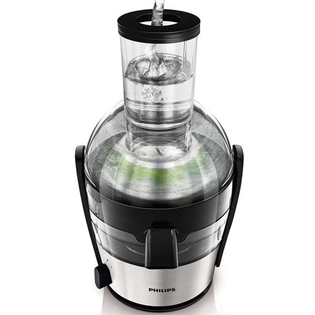 Philips katı meyve sıkacağı, pazardaki ön temizleme fonksiyonuna sahip bir numaralı santrifüjlü katı meyve sıkacağıdır. İticiye su dökerek cihazın içinden bol miktarda su akıtır ve kapaktaki istenmeyen lifleri temizlersiniz; böylece süzgeç temizliği kolaylaşır.